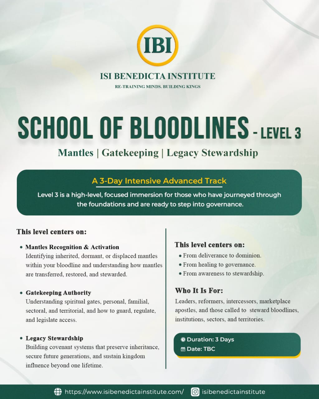 This is about: From deliverance to dominion. From Healing to governance. From awareness to stewardship. Who It is For: Leaders, reformers, intercessors, marketplace apostles, and those called to steward bloodlines, institutions, sectors, and territories. Duration: 3 Days Dates: To Be Communicated